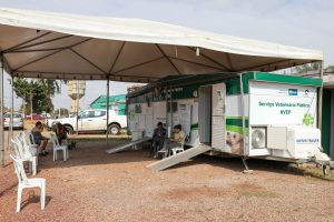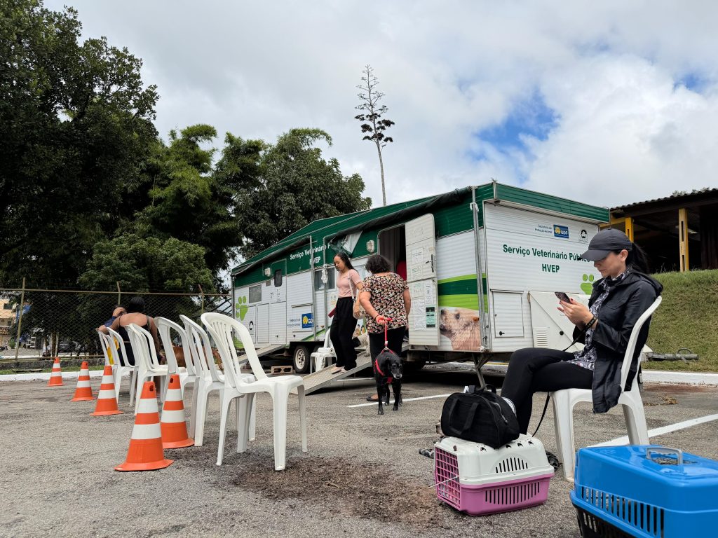 Serviço de atendimento veterinário gratuito e itinerante, com trailer equipado para atendimento clínico.